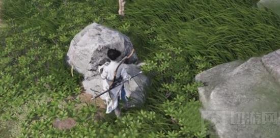 走到屋子后面,会看到许多大石头,齐声就在这些大石头后面。