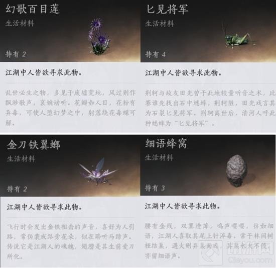 齐声所需奇巧包括:细语蜂窝、匕见将军、抬头见花红、幻歌百目莲、金刀铁翼螂。将找到的奇巧交给齐声后,他就会传授武学。