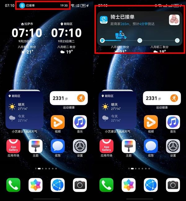 日常使用中,原生鸿蒙用户只需瞥一眼屏幕,通过实况窗就能在锁屏、熄屏、通知栏、状态栏等位置查看实时动态,比如是否有司机接单、车牌号,以及外卖距离等等信息。