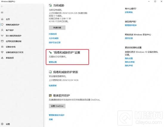 4.打开病毒和威胁防护设置,选中管理设置。