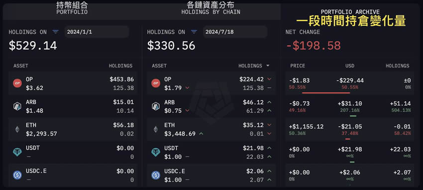第一象限:和投资组合构面有关,三个分页PORTFOLIO:该地址目前的持币组合HOLDINGS BY CHAIN:在不同区块链上的资产分布PORTFOLIO ARCHIVE:比较两个不同时间点的持仓变化量例如下面这张图,是切换到「PORTFOLIO ARCHIVE」分页的介面。