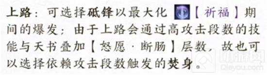 焚身:依赖攻击段数触发的法宝,适合上路通过高攻击段数的技能与天书叠加【怒愿·断肠】层数的战斗风格。