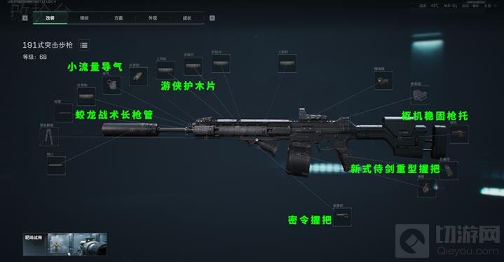 在枪管和枪口方面,我选择了【蛟龙战术长枪管】和【先进多口径消音器】,这两个配件的组合能够提升射程、初速、据枪稳定性、后坐力控制以及开火时的稳定性,并且还具有消音效果。再加上5片【游侠护木片】,可以进一步增强后坐力控制。这样一来,191在后坐力控制方面就没有什么问题了。