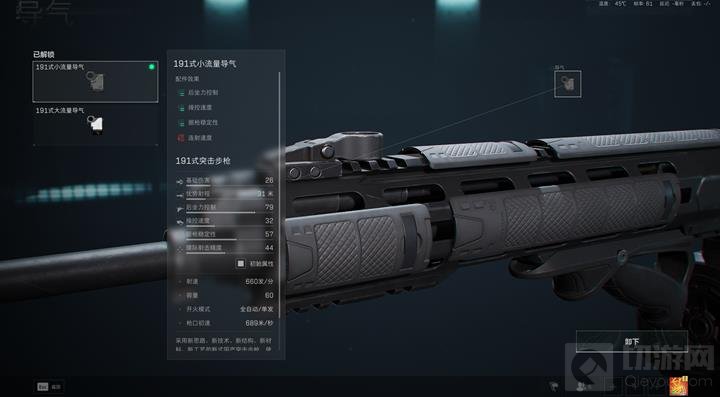 【导气】配件有两种选择,【大流量导气】可以提高射速至759rpm,相应的TTK降低至237ms至158ms,但会牺牲后坐力控制、操控速度和据枪稳定性。