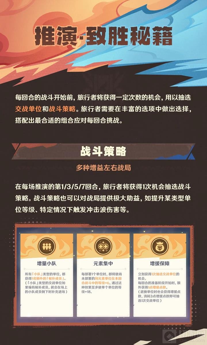 多种增益左右战局。在每场推演的第1/3/5/7回合,旅行者将获得1次机会抽取战斗策略。战斗策略也可以对战局提供极大助益,如提升某类单位等级、特定情况下触发冲击波伤害等。