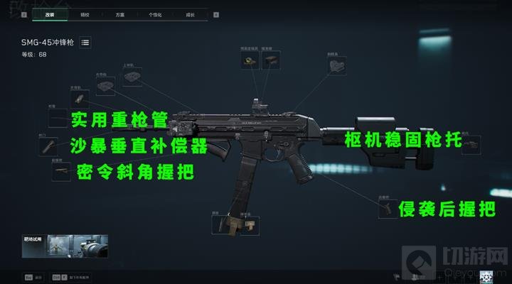 SMG-45的配装相对简单,核心配件为40发扩容弹匣。其他配件可根据个人喜好选择。我的建议如下:首先,枪管选择【实用枪管】。虽然其属性不如长枪管,但负面效果较小,而且SMG-45作为冲锋枪,灵活性至关重要,射程的微小差异并不显著。