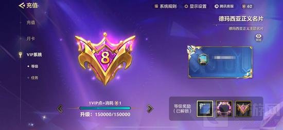VIP8所需要求:需要达到150,000VIP点,需要充值1500元对应奖励:解锁VIP限定动态主题名片:德玛西亚正义