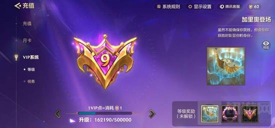 VIP9所需要求:需要达到500,000VIP点,需要充值5000元对应奖励:解锁VIP限定全屏攻击特效:加里奥登场。