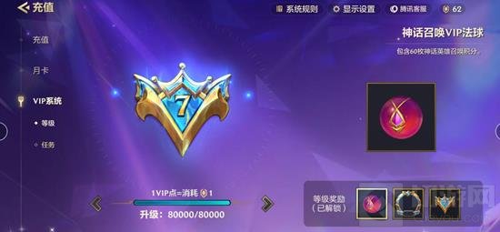 VIP7所需要求:需要达到80,000VIP点,需要充值800元对应奖励:获赠神话英雄召唤积分x60,用于神话英雄召唤。