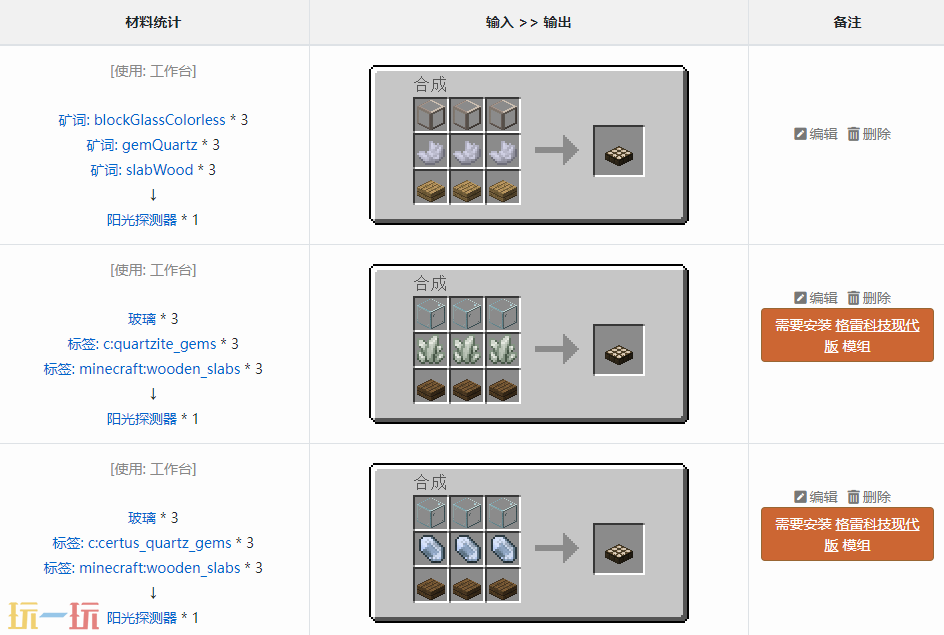合成制作:需 3 个玻璃、3 个下界石英、1 个红石粉,合成配方为:工作台 3×3 网格中,顶部一行放 3 个玻璃,中间一行放 3 个下界石英,底部中间放 1 个红石粉,合成后获得 1 个阳光探测器,可批量制作满足红石电路需求。