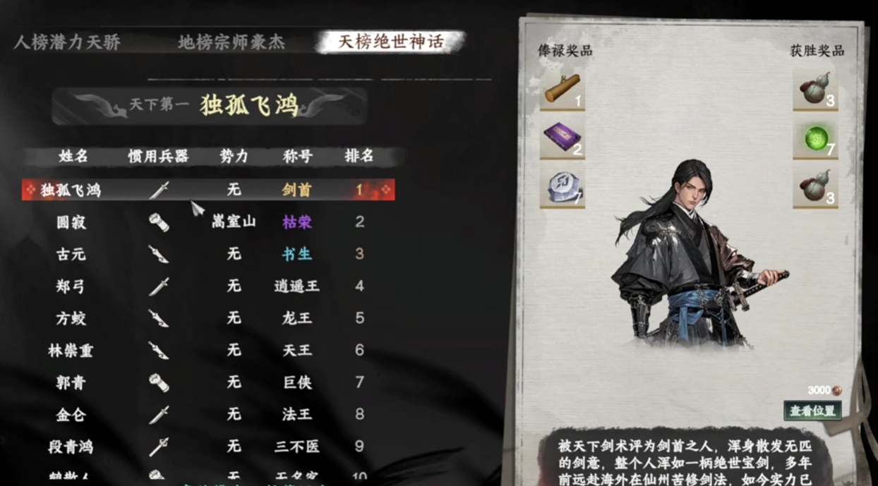 想要获得流光追影,玩家们需要打开侠云录,在侠云录中再点开兵器谱-神兵这一界面,此时玩家们就可以看到排名第一的流光追影并看到持有人,在游戏中持有流光追影的人是独孤飞鸿,接下来就需要玩家们去寻找独孤飞鸿了,在游戏中玩家可以在无双榜的天榜绝世神话中找到独孤飞鸿,此时玩家在界面中发现可以直接查看位置,但是需要3000铜钱,在使用了铜钱之后,玩家就可以直接在飞鸽中侠云阁信使的消息直接得到独孤飞鸿的具体位置,玩家们只需要在地图直接搜索就可以找到他了。