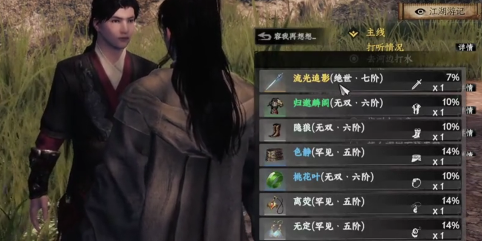 第二种方法就是可以直接巧取流光追影,在遇到独孤飞鸿之后直接交互点击巧取,但是在巧取之前,玩家可以点开所需要的物品查看能够取到的概率,概率一般偏低,但是概率也可以被提高,需要玩家达到境界-陆地神仙左右,此时巧取到的概率就会大大提高,随着玩家将境界逐渐的提高,巧取的概率也会随之提升。