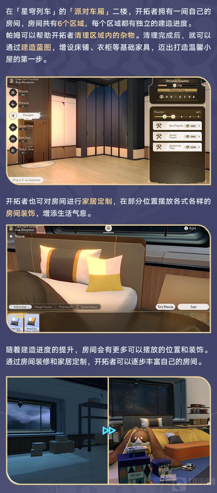 在活动中,玩家可以清理并装饰星穹列车的派对车厢二楼房间,房间分为6个独立区域,每个区域都需要清理杂物并建造家具。帕姆会协助玩家完成清理任务,解锁建造功能。初期的家具包括床铺、衣柜等基础设施,随着建造进度的提升,将解锁更多可用区域和装饰摆放位置。玩家可以根据个人喜好自由摆放家居装饰,逐步打造个性化房间。通过完成装修任务,玩家不仅能改善房间的视觉效果,还能提升游戏中的成就感。