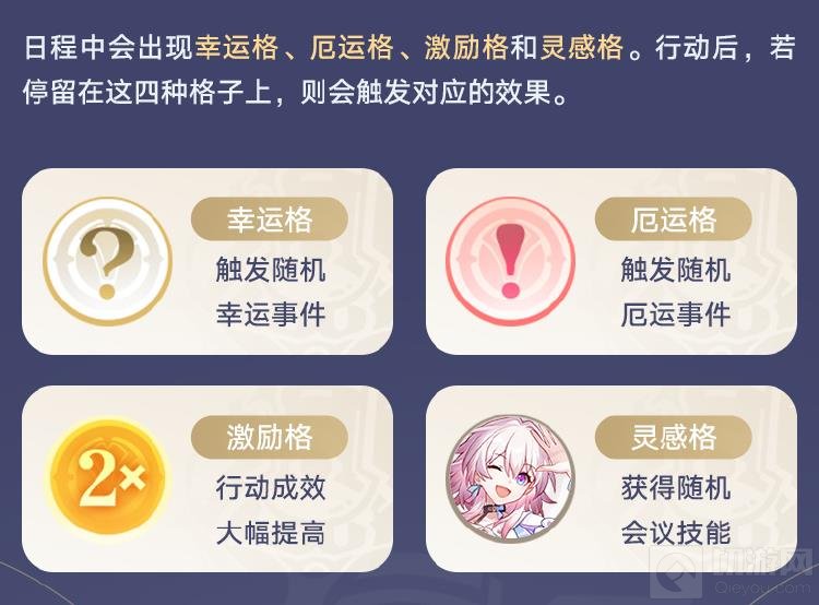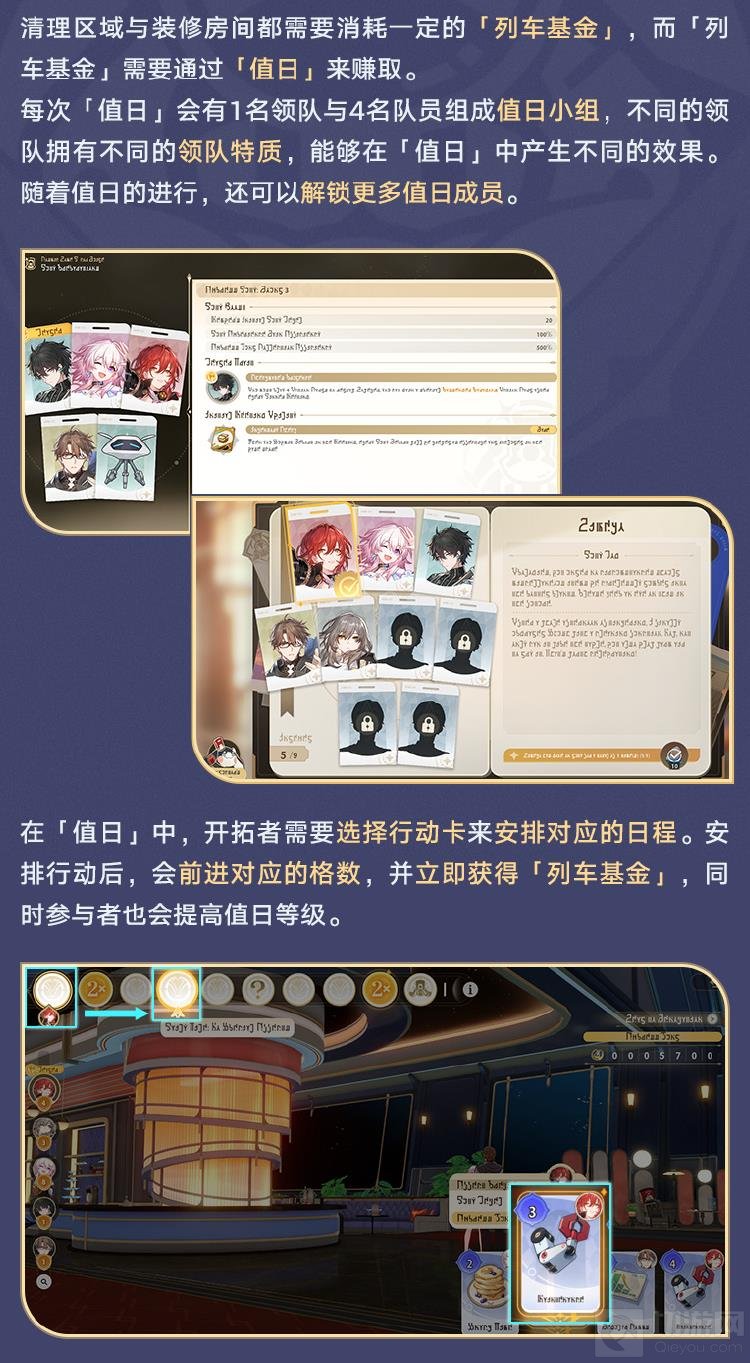 装修房间需要消耗“列车基金”,玩家通过“值日”系统来获取这项资源。值日任务需要配置1名领队和4名队员,领队特质决定了队伍在值日中的表现和收益。值日过程中,玩家会通过行动卡来选择日程,并推进到对应格子上,不同的格子触发不同效果,具体效果如下: