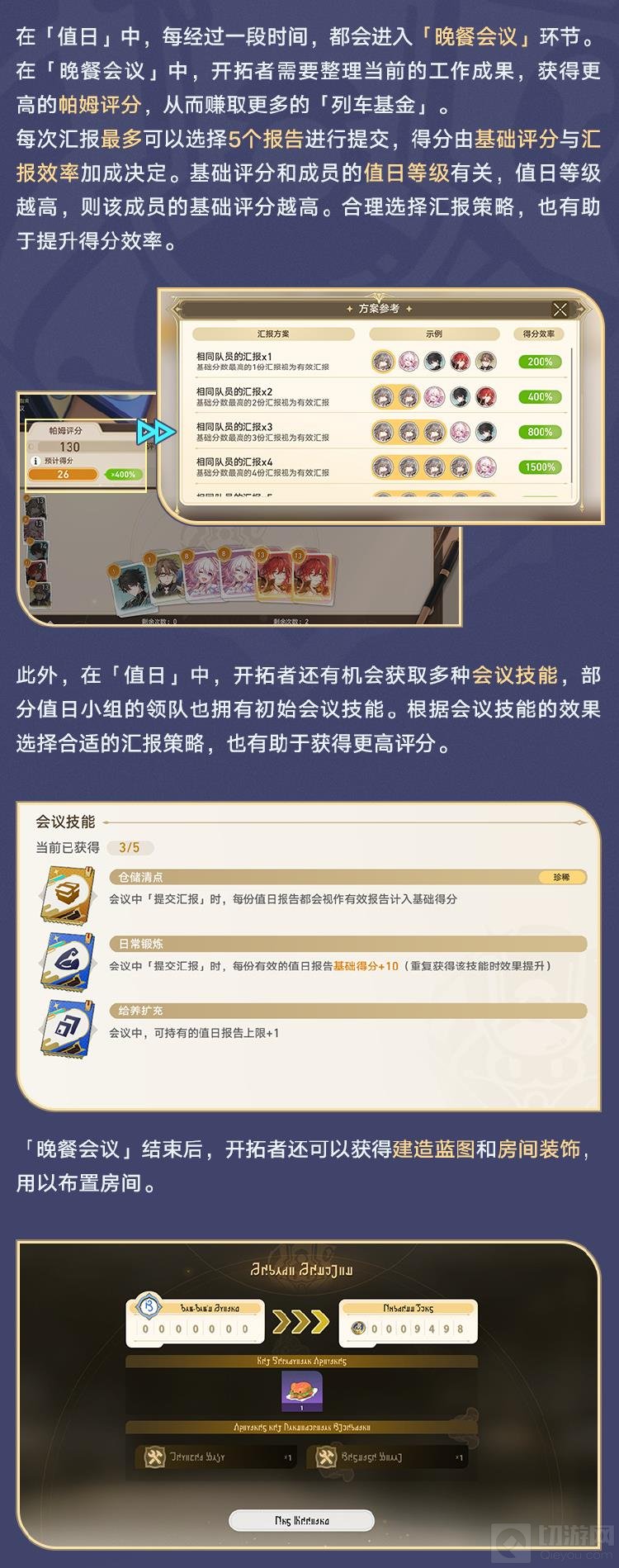 在值日任务中,每经过一定时间,玩家将进入“晚餐会议”环节。这一阶段,玩家需要提交任务报告以获取帕姆的评分,并赢得更多列车基金。提交的报告数量最多为5份,其得分取决于成员的值日等级和汇报效率。领队和队员的会议技能对提升得分尤为重要,玩家可以根据技能效果选择适合的汇报策略,从而优化评分。通过完成晚餐会议,玩家还能解锁新的建造蓝图和房间装饰,使房间布局更加多样化。