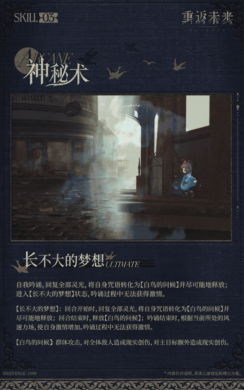 【长不大的梦想】:回合开始时,回复全部灵光,将自身咒语转化为【白鸟的问候】并尽可能地释放;回合结束时,释放【白鸟的问候】;吟诵结束时,根据当前所处的风速力场,使自身激情增加。吟诵过程中无法获得激情。【白鸟的问候】:群体攻击,对全体敌人造成现实创伤,对主目标额外造成现实创伤。