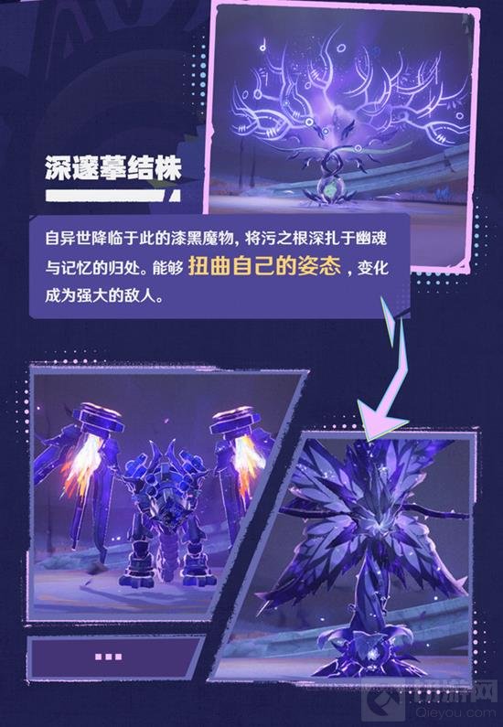 深邃摹结株是来自深邃晦暗的异界,侵蚀大地中记忆的漆黑魔兽。能够扭曲自己的姿态,变化成强大的敌人。其部分攻击会施加可叠加的「蚀破」状态,会在一定时间后,使队伍中自己的当前场上角色损失生命值。战斗中,深邃摹结株会进行「晦暗祝祷」,为自己赋予虚界力护罩。如在此时利用元素攻击到一定次数破坏护罩,即可使其陷入混乱,具有夜魂性质的元素攻击会更有效率地突破其防御。