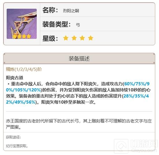 烈阳之嗣:作为四星武器,烈阳之嗣提供对单重击增伤,是林尼在没有五星武器时的不错选择。