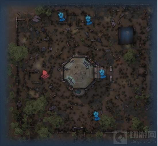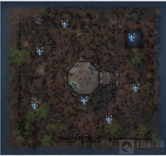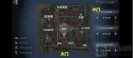 求生者的实际刷点在以图中位置为中心,半径15米范围内随机出现,而监管者的刷点是固定的。在区域选择阶段,地图被划分为9~12个区域,玩家可以自主选择区域出生。