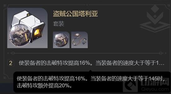 如果队伍的速度可以达到145以上,盗贼套能够提供稳定的击破特攻加成。盗贼套的四件套效果可以在乱破使用终结技后提前自身行动时间,进一步加强其爆发能力。这个套装常态提高击破特攻,当进战后速度达到145时可以额外再获得击破特攻。是乱破比较通用的套装,只要速度达标就都可以使用。