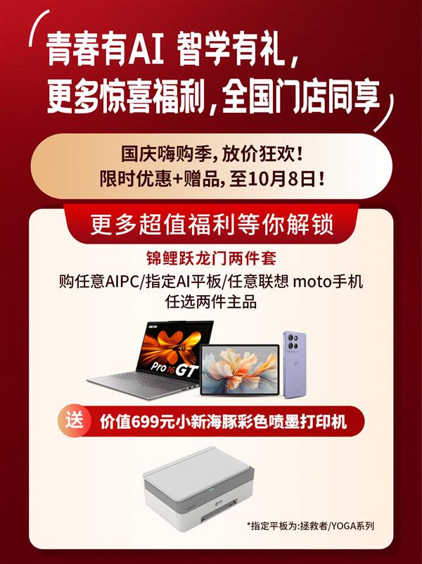 线下福利热潮涌动,线上促销同步狂欢。10月1日至8日,联想线上各大官网平台以“青春有AI 智学有礼”为主题,为用户们同样准备了不输线下门店的福利。除了同样享受线下门店的认证学生用户购机最高立减2000,保值换新服务到手99元起,购买“青春有AI全家桶”赠1899元拯救者自行车等优惠之外,联想还为小初高学生党及家长们准备了“锦鲤跃龙门两件套”(任意AIPC/指定AI平板/任意moto手机,任选两件主品),购机即可赠送价值699元的小新海豚彩色喷墨打印机。这款打印机不仅适合学生整理错题、打印学习资料,也能帮助家庭在十一假期结束后,将全家出游的温馨照片打印成册,留存专属于家人的记忆。