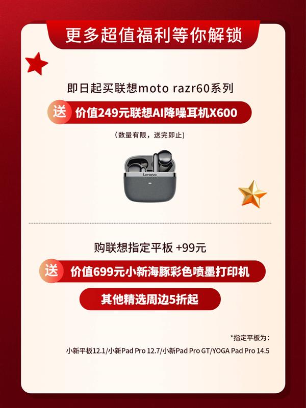 即日起购买联想moto razr 60系列,还可附赠价值249元的联想AI降噪耳机X600,无论是在嘈杂的旅途还是需要专注的学习环境中,都能为用户带来沉浸式的音频体验。购机用户还可享受精选周边产品5折起优惠,购买联想指定平板机型加99元即得小新海豚打印机等等。多项福利联动,助力大家在国庆期间都能轻松配置想要的AI装备。