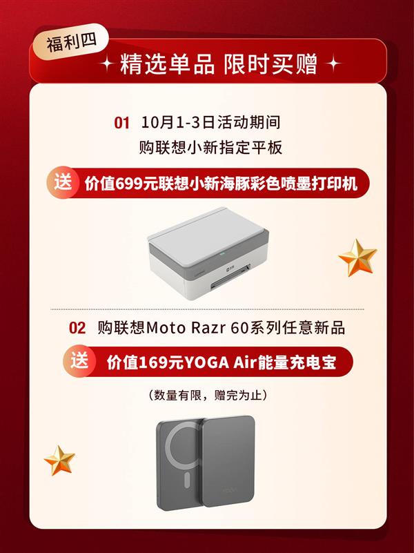 针对追求高效与时尚的消费者,联想在国庆期间推出买赠礼遇,让智能设备与实用赠品深度结合,一站式提升使用体验。到线下门店选购联想小新指定系列平板,可获赠价值699元的小新海豚彩色喷墨打印机;选择潮流折叠屏联想moto razr 60系列任意新品,则可免费得价值169元的YOGA Air能量充电宝。如果你选择搭载高通骁龙8Gen 3旗舰芯片、性能惊艳的联想小新Pad Pro GT平板电脑时,配合随机赠送的小新海豚彩色喷墨打印机,可轻松实现“课堂笔记即时整理、报告撰写一气呵成”的高效学习场景——仅458克的轻薄机身方便携带穿梭于教室与图书馆,而打印机的加持更让资料输出随时可达,宿舍学习效率倍增。