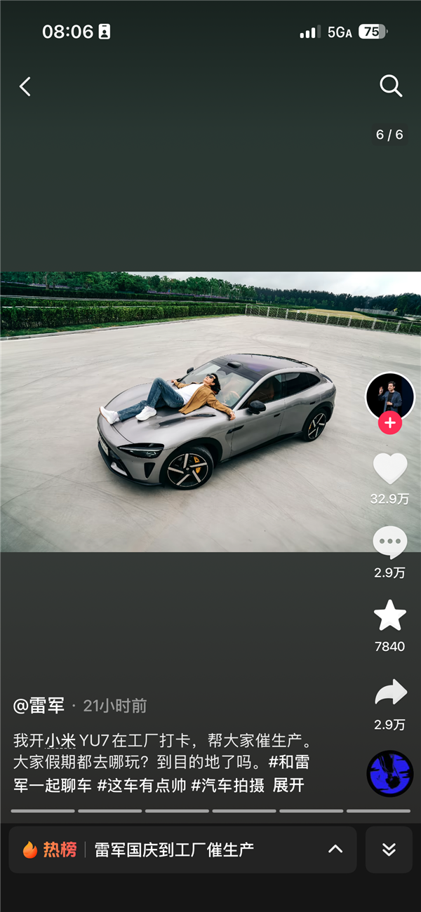 雷军在配文中写道:我开小米YU7在工厂打卡,帮大家催生产。大家假期都去哪玩?到目的地了吗。