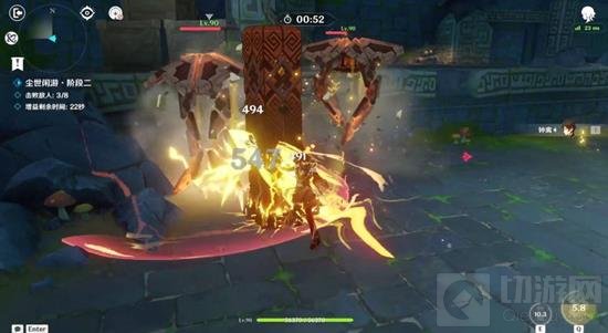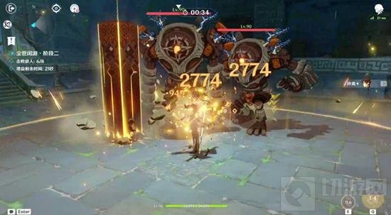 第二阶段则要求玩家利用冲击波消灭三波敌人。在地图的四个角落会刷新岩晶,玩家需要在强化时间内打碎这些岩晶,以获得强化效果。在强化期间,玩家的普通攻击每隔4.5秒会释放强大的冲击波,对全屏敌人造成接近7万伤害。玩家需要利用这个机制,及时补充护盾,并在四次冲击波后消灭敌人。