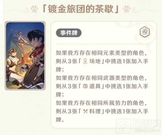 如果我方存在相同元素类型的角色,则从3张「场地」中挑选1张加入手牌;如果存在相同武器类型的角色,从3张「道具」中挑选1张加入手牌;如果存在相同所属势力的角色,从3张「料理」中挑选1张加入手牌。