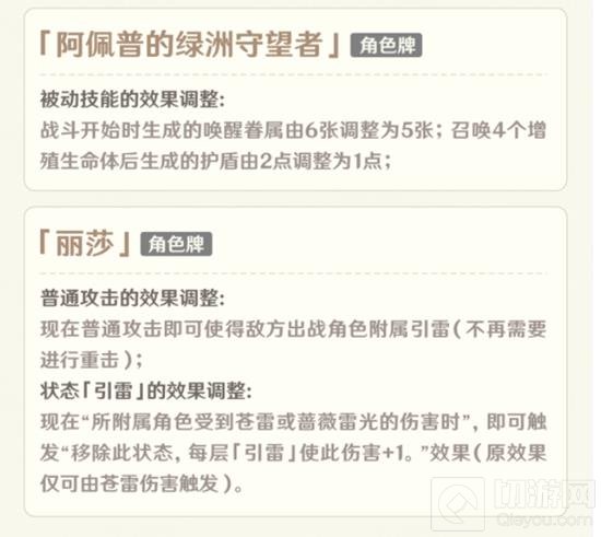 调整内容:普通攻击的效果调整为立即附属「引雷」,不再需要重击。「引雷」状态的效果也进行了调整,现在「引雷」状态可被丽莎的苍雷和蔷薇雷光伤害触发,提升伤害。