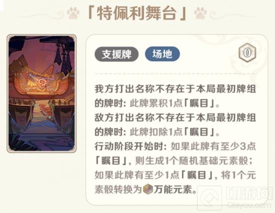 当我方或敌方打出名称不在本局最初牌组中的牌时,该牌会累积或减少「瞩目」点数。行动阶段开始时,如果有至少3点瞩目,生成1个随机基础元素骰;有至少1点瞩目时,将1个元素骰转换为万能元素。