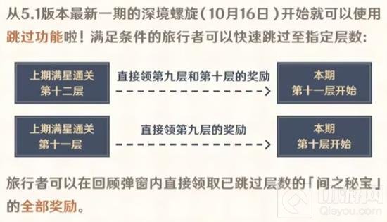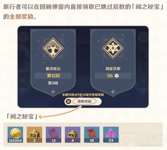 具体来说,如果旅行者在前一个周期中满星通过第12层,则可以在新周期中跳过第11层的挑战,直接领取第9层和第10层的奖励。同样,满星通过第11层的玩家可以跳过第10层,直接领取第9层的奖励。这个功能大大减少了玩家重复挑战的时间,使得挑战过程更加流畅。
