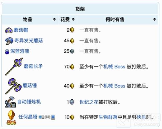 出售各种蘑菇主题的物品,包括但不限于蘑菇帽、奇异发光蘑菇、深蓝溶液、蘑菇长矛、蘑菇锤、自动锤炼机,以及在特定条件下出售的晶塔。