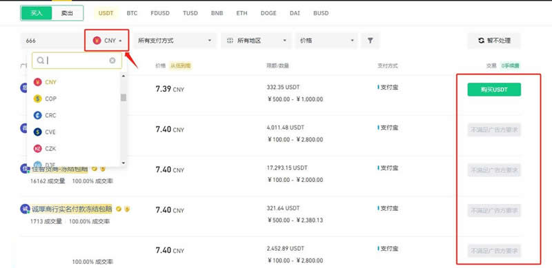2、选择购买【币种USDT】,选择【支付方式】,选择合适的广告主就可以完成USDT购买
