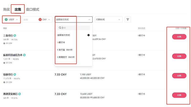 11、选择【出售】,选择币种USDT,选择支付方式,选择合适的上架进行出售,就完成USDT搬砖,其中产生的差额就是USDT搬砖的利润。