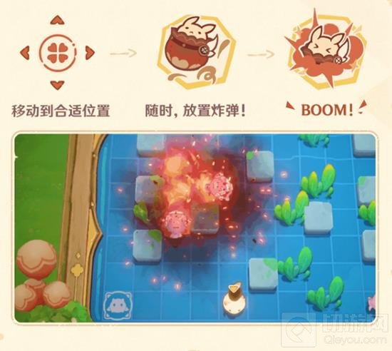 活动玩法基于经典的炸弹人游戏改编而来,玩家需要操纵嘟嘟可在棋盘上面布置炸弹,炸弹会在数秒后爆炸并对十字范围内的所有人造成伤害,玩家需要注意躲开炸弹范围或者寻找掩体。否则炸弹炸到自己会掉血。在挑战中血条掉光(活力值耗尽),还可以进入“轻快模式”继续完成挑战。