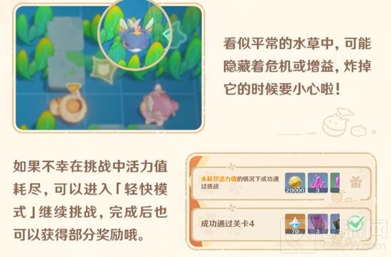 从活动开始的第一天起,每天会解锁一个新的关卡,共计6关。每关完成挑战即可获得70原石,总计可以获得420原石的奖励。此外还有经验书、摩拉、原矿等常规素材,以及瓦片系列的武器突破素材。