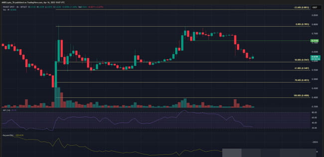 聚焦4小时图表,4月5日的反弹行情后,PI价格现回落至斐波那契50%回撤位0.595美元附近。短期指标显示: