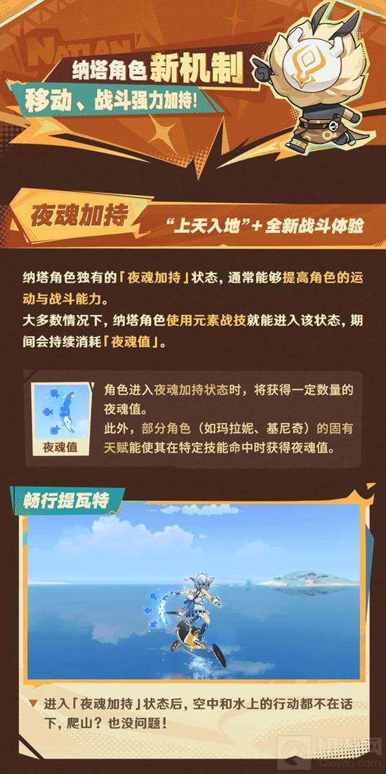 纳塔角色特有的「夜魂加持」状态能够让角色在战斗和探索过程中获得显著的增益。大多数情况下,纳塔角色只需使用元素战技即可进入夜魂加持状态,期间会持续消耗「夜魂值」。进入此状态后,角色的移动和战斗能力都将得到提升,甚至能在空中和水上自如行动,爬山也变得轻而易举。