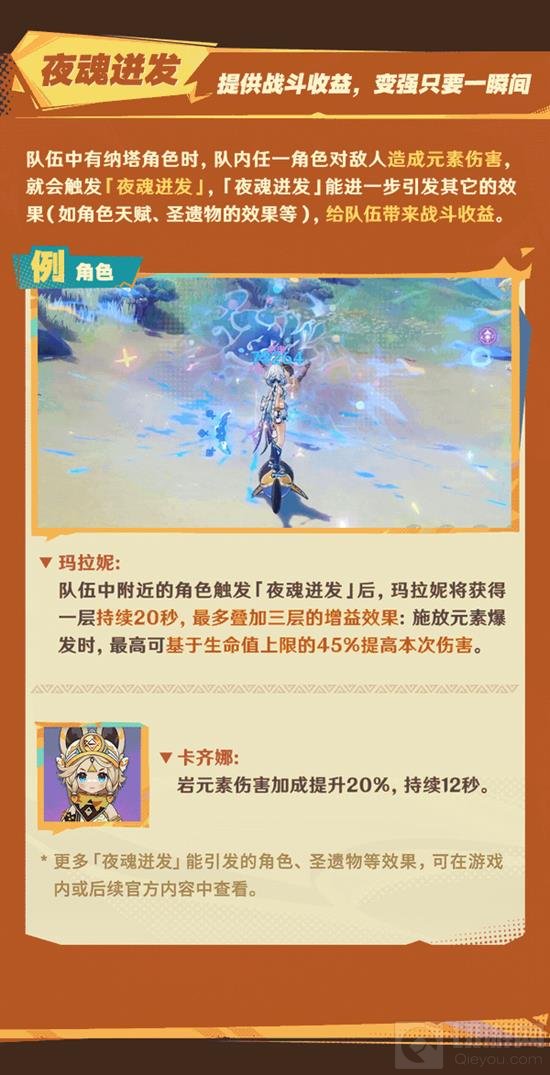 当队伍中有纳塔角色时,队伍内的任一角色对敌人造成元素伤害,就会触发「夜魂进发」,进而引发一系列战斗增益效果。例如,玛拉妮在队伍中附近的角色触发「夜魂进发」后,可以获得最多三层持续20秒的增益效果,这能让她在施放元素爆发时,最高可基于生命值上限的45%提高本次伤害。而对于卡齐娜来说,则是岩元素伤害加成提升20%,持续12秒。