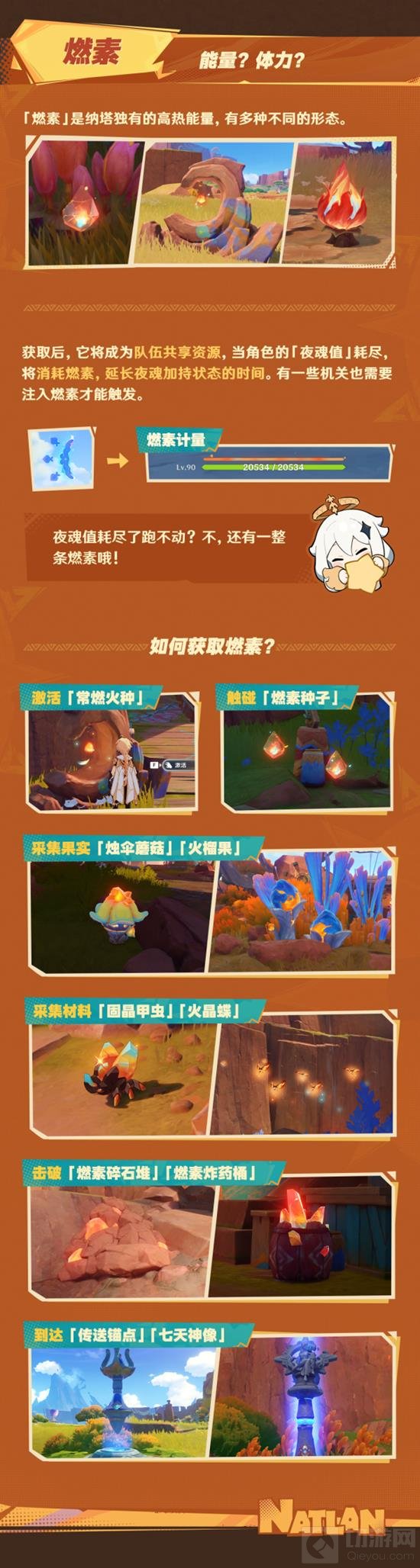「燃素」是一种队伍共享资源,它能够为纳塔角色补充「夜魂值」,延长夜魂加持状态的时间。燃素可以通过多种途径获取,包括激活「常燃火种」、触碰「燃素种子」、采集特定植物如「烛伞蘑菇」和「火榴果」、采集特殊生物如「固晶甲虫」和「火晶蝶」、击破「燃素碎石堆」和「燃素炸药桶」等。此外,到达「传送锚点」和「七天神像」也可以获得燃素。