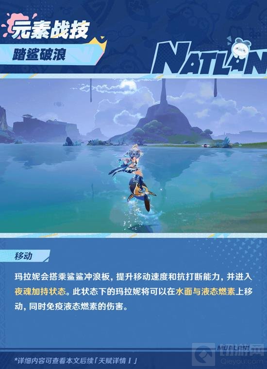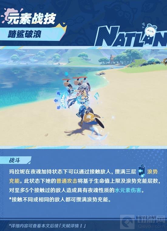 技能描述:玛拉妮施放E技能后,获得60点夜魂值并进入夜魂加持状态。在此状态下,玛拉妮可快速移动并在水面行走,并且普通攻击将转变为鲨鲨撕咬,造成基于生命值上限的水元素伤害。