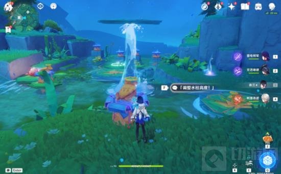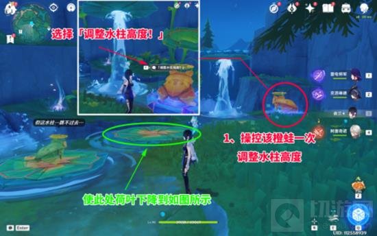 到达指定地点后,玩家会发现一个橙色的纸蛙。接下来,需要调整水柱的高度,使荷叶下降,以便阿绿能够顺利前进。