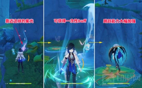 如果遇到水柱,需要让旁边的纸蛙调整水柱的高度,使荷叶下降,以便阿绿能够跳到更高的地方。