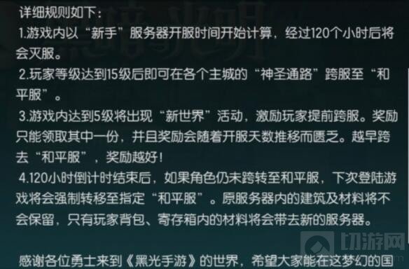 2、前期为玩家熟悉基本操作的服,通常情况下萌新到达15级按照系统提示下离开新手服转和平服,也不避免有个别小伙伴在新手服建完家不想离开,但是新手服会在120小时后毁灭,所以建议新手服不要建家或者不要搞基础设施,最好开服第一天就去和平服。