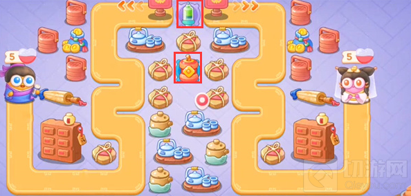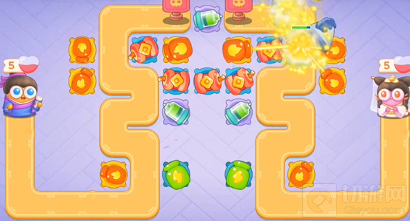 3、将左右两侧的药包清理掉,然后继续放置火瓶,用炮仗攻击出怪口下方障碍物。在两侧放置火瓶,清理大抽屉。