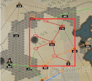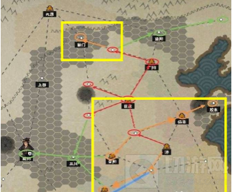 3、第三步绿线:此时已经较强了,可以等渔阳出兵伐空白(此时渔阳只有千余人,是否出兵很明显,会有小人在扎营)的时候出兵,白嫖一座城,集中进攻三川,快速入主咸阳,基本上吃了咸阳的经济就随便玩了。