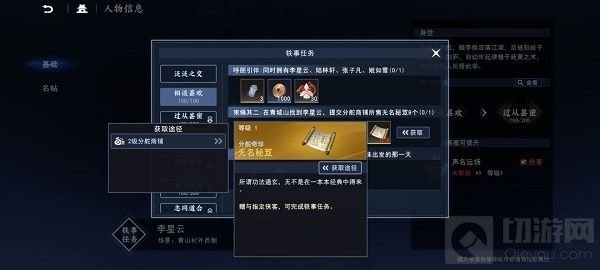1.不同的侠客,轶事任务也不同,以李星云为例,需要拥有李星云,陆林轩,张子凡和姬如雪,我有姬如雪这个没法完成是不可抗力,而下面那个任务只需要8个无名秘籍,我们可以查看它的获取途径。