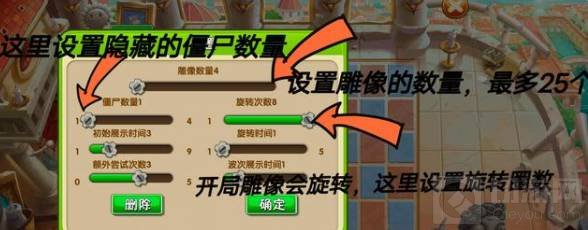 4、僵尸迷阵:这个玩法比较考验记忆力和眼力,主要玩法就是自己设置雕像数量、僵尸数量、以及雕像选择圈数。游戏开始,隐藏的僵尸会特别展示出来,时间只有几秒,然后雕像开始转圈,停下来后由玩家找到隐藏的僵尸,考验的就是玩家的记忆力和眼力。